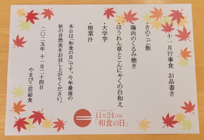 11月後半の行事食は24日(月)に、今年も「和食の日」でしたので、今年最後の秋の味覚ふんだんのお食事を提供させていただきました。