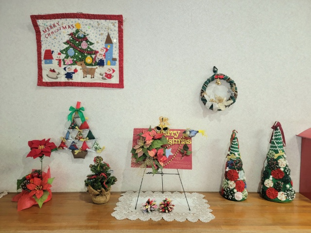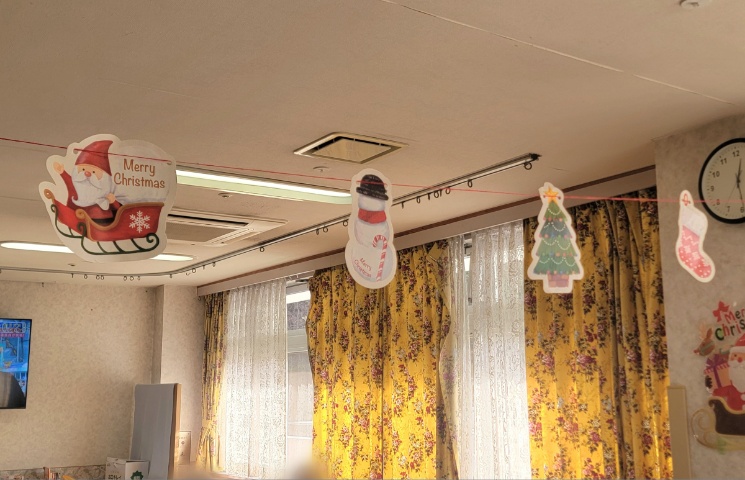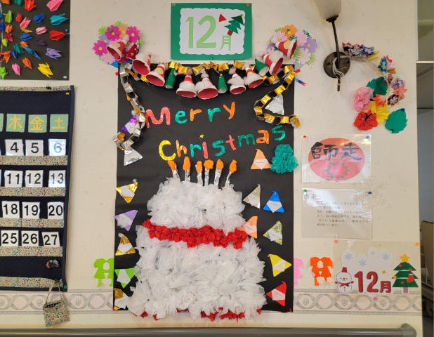 去年はポインセチアでしたが、今年はケーキの大作が飾ってありました! 横や上にはミニサンタも飾られております。「上のはベルですね!」と言ってしまったところ、「サンタだよ!」と、デイサービスでも訂正を受けてしまいました(笑)