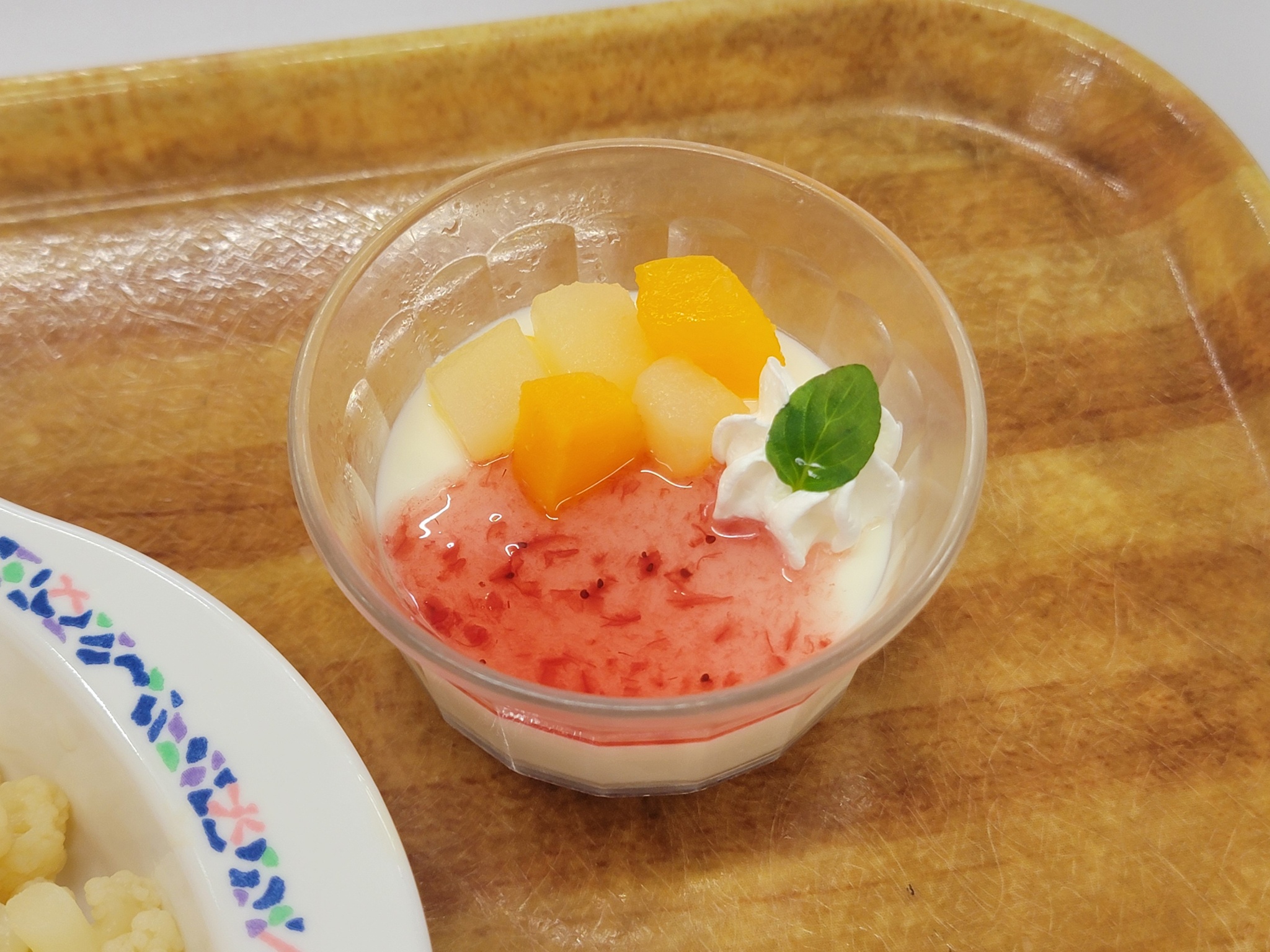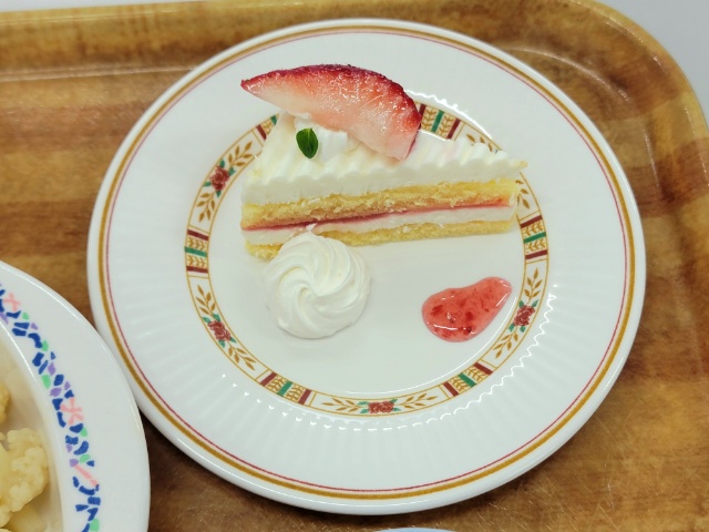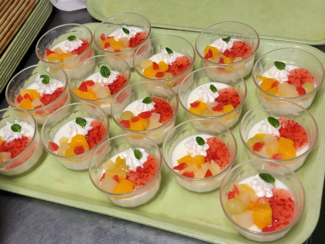 大変なパンナコッタの準備は朝一から、パンナコッタを冷やし固めて、果物→ホイップ→苺ソース→ミントと順に盛り付けてと、厨房職員頑張ってくれました。丹精込めて仕上げられたパンナコッタは、特養とデイサービスの皆様のデザートに提供。おやつの提供がないケアハウスの皆様には、デザートでショートケーキを提供させていただき、特養とデイサービスの皆様には、おやつにケーキを提供させていただきました。