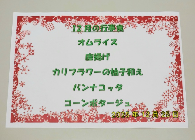 午前中にクリスマスの催し物があったフロアの方は、「疲れた…(笑)」と苦笑いされている方もいらっしゃいましたが、食事はモリモリ召し上がっていただけていました。