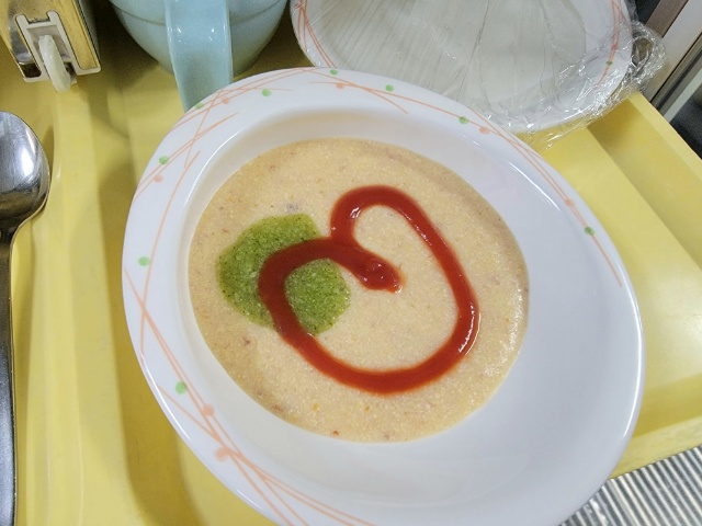 この日の昼食、提供前に厨房へ確認に行くと、なんと調理師の愛で調整食のオムレツのケチャップがハートでした♡