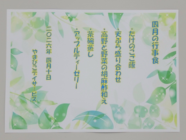 4月最初の行事食は10日(金)に、毎年恒例の「春を感じられるお食事」を提供させていただきました。