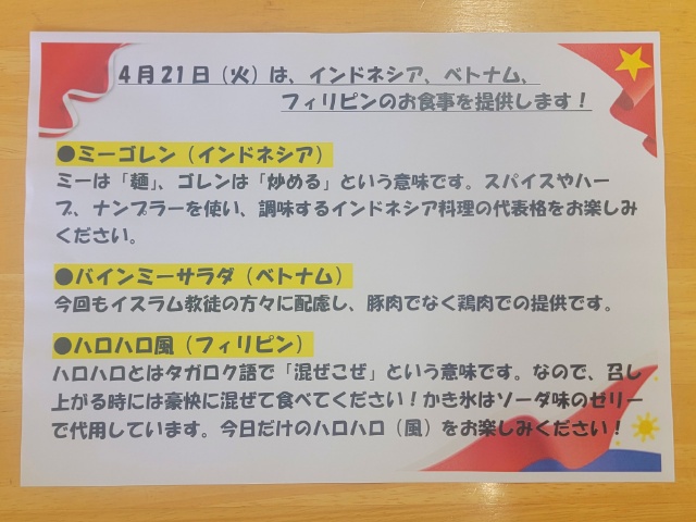 4月後半の行事食は21日(火)に、多国籍なお食事を提供させていただきました。