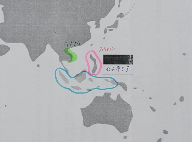 「苦手」と言われる方や、使用した調味料などのご説明をしても「何味?分からない…普通の焼きそばが良い」と言われる方もおられましたが、フロアで地図が準備され、「ここがインドネシア、ここがフィリピン、ここがベトナムです」と解説、利用者様方は地図を見ながら食事され、「国が近いから似たように思えるけど、ちゃんと違う国同士なんだよね」「なんだか行った気になってきた(笑)」と言われたりして、盛り上がる場面もありました!