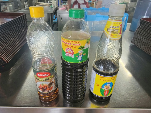 調味料は左から、ナンプラー、魚介の旨味がある醤油、甘めな醤油です。
